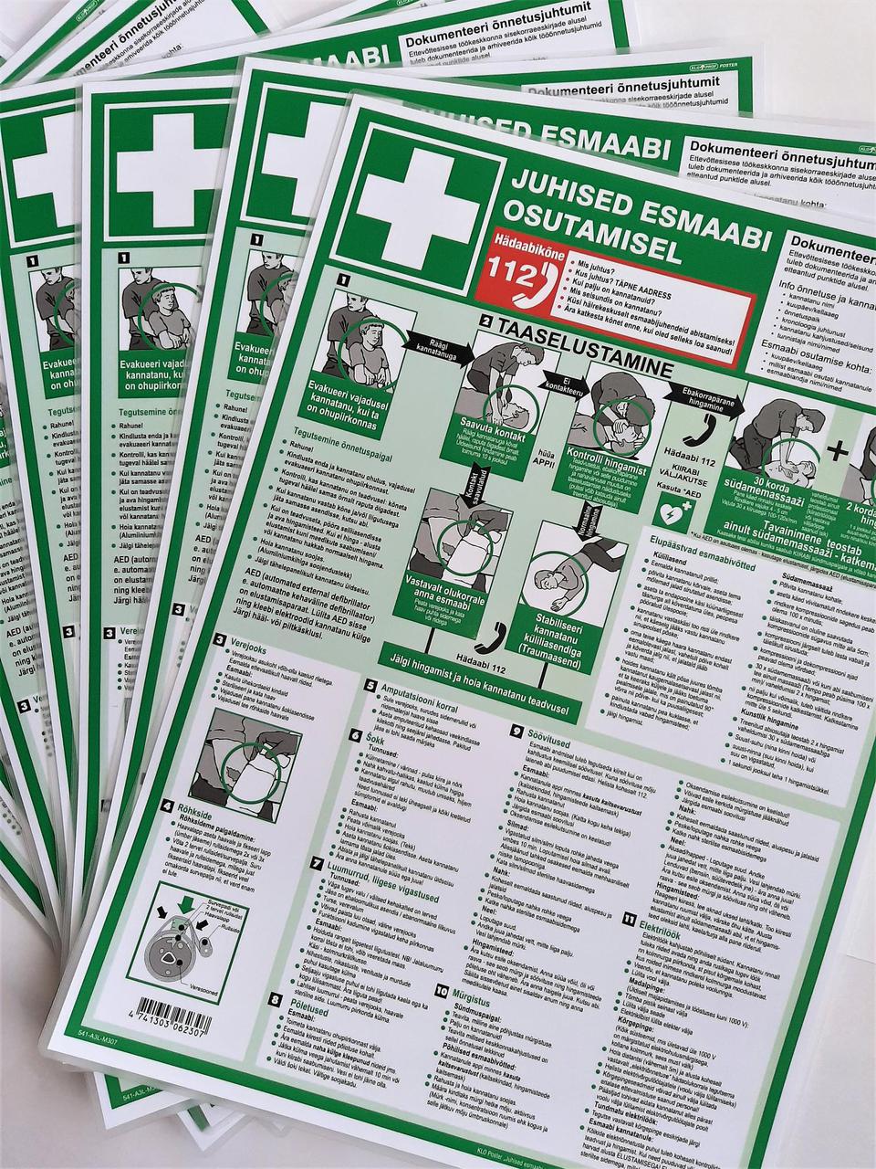 Paigutada esmaabikomplekti juurde nähtavatele kohtadele juhendmaterjalid esmaabi andmise viisidest (plakatid, brožüürid jm näitlikud materjalid).